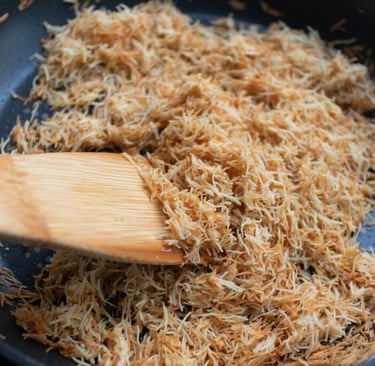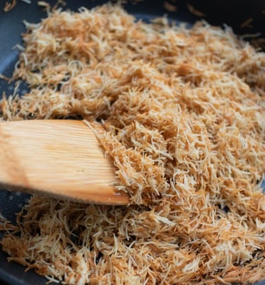 In a large pan, melt the butter over medium heat. Add the kataifi and toast for about 5 minutes until golden brown and flaky.