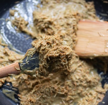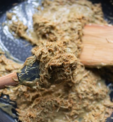 Turn off the heat and mix in the pistachio butter and tahini until fully combined. The filling should be smooth with bits of toasted kataifi for crunch.